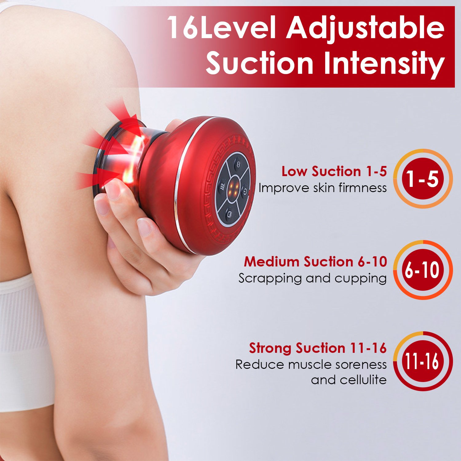 *16Level Temperature & Suction*:Come with 16 levels of red light heating therapy and suction pressure,you can choose the desired level according to personal demands. Up to 113°F temperature works great on breaking down the excess lactic acid in the muscles and promoting blood circulation. Additionally,deep negative pressure mode is aimed for people after intense training while smooth breathing mode helps relieve body fatigue by rhythmical and continuous suction and release.